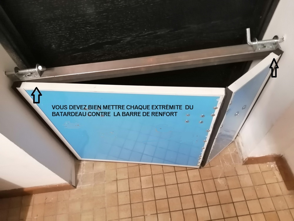 5) Une fois votre batardeau mis en place contre votre barre de renfort à chaque extrémité impérativement ; vous poussez au centre le batardeau contre la barre de renfort , ce geste permet d'étendre la barrière horizontalement en exerçant une force de compression sur les joints latéraux contre les murs gauche et droit